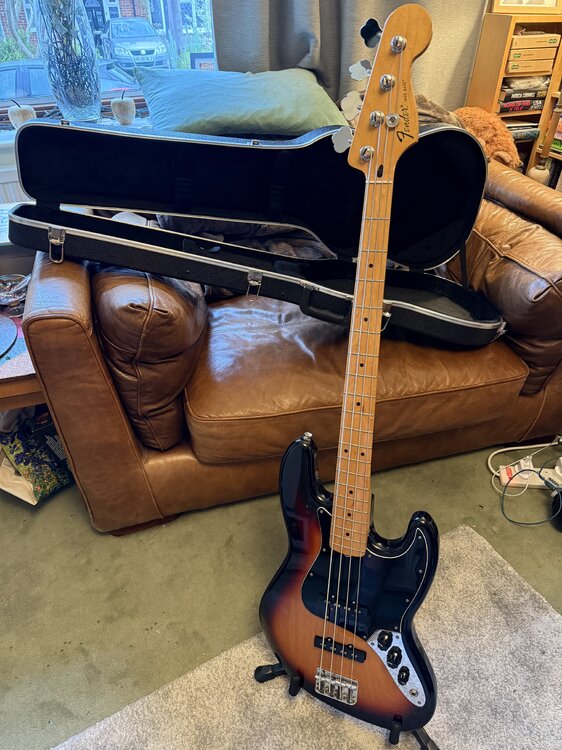 SWMBO has decreed that I have enough basses... Problem is she can't tell the difference between a MIM Fender Jazz and an American Professional II Precision... as long as they're both in Sunburst. So, this one is being quietly sold to make way... It's a 2014 Standard Jazz (Mexico), has a couple of dings - one on the head and the other just next to the bridge - both fairly small. Otherwise in good shape - usual scuffs on pickguard and pickup covers. Hard case included in sale. Cash on collection from Effingham (near Leatherhead/Guildford) in Surrey. You're most welcome to try before you buy.