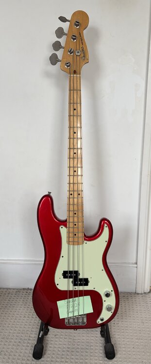 Lovely circa 87 MIJ 57 Reissue P Bass in Candy Apple Red. £950 with hard case. PB57-55 I think. Maple neck. E serial number, Fujigen Gakki-made. It's a lovely bass, I've just never really got on with the neck shape. Some oxidation on metalware and some road dinks - see pics - but in great condition/playability. Comes with after-market heavy(!) duty case. I'd prefer collection only (west London) as it's so heavy (due to the case), but open to discussing couriers.