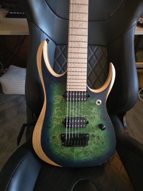 Selling my Ibanez RGD Iron Label RGDIX7MPB 7 String as I tend to reach for other guitars nowadays. Bridge pickup has been upgraded to a Bareknuckle Ragnarok and I still have the original. Currently tuned down to drop E but new set of strings and it'll be easy enough to put back to Standard. Couple little dings in the finish that have been pictured. I can post at cost but will need a bit of time to find a box! Official specs below Specifications Body & Bridge Body: Ash Top: Poplar Burl Construction: Bolt-On Finish: Surreal Blue Burst Binding: None Bridge: Gibraltar Standard II-7 Neck & Fingerboard Neck: 3pc Maple/Bubinga Neck Profile: Nitro Wizard-7 Fretboard: Birdseye Maple Frets: 24 Jumbo Inlays: None Scale Length: 26.5” Hardware & Electronics Controls: 1 x Volume, 3-Way Toggle Switch Bridge Pickup: DiMarzio Fusion Edge Humbucker Neck Pickup: DiMarzio Fusion Edge Humbucker Tuners: Gotoh MG-T Locking Hardware: Black