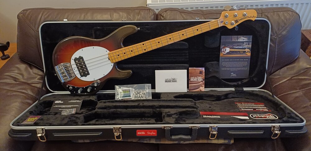 2016 Music Man 40th Anniversary "Old Smoothie" StingRay in as new condition with original case (and keys), literature, '76 vintage "radio" control knobs fitted (original chromes included) and black (BWB) USA pickguard fitted with white (WBW) original pickguard included. Price is £2,850 or near offer collected from Bury St Edmunds or localish meet up. Thanks for looking. Specifications:- Body Wood Alder. Body Finish High gloss polyester. Body Color Chocolate 3TS. Bridge Music Man® chrome plated, hardened steel bridge plate with vintage stainless steel saddles and adjustable mute pads. Scale Length 34" (86.4 cm). Neck Radius 7.5" (19.1 cm). Frets 21 - Low profile, narrow width Neck Width 1-11/16" (42.86 mm) at nut 2-1/2" (63.5 mm) at last fret. Neck Wood Select maple neck. Fingerboard Select maple. Neck Finish High gloss polyester. Neck Color Natural aged light yellow finish. Tuning Machines Schaller BM, with tapered string posts. Neck Attachment 6 bolt neck plate. Controls Custom "Old Smoothie" 2-band active preamp; vol, treble, bass. Pickups Custom "Old Smoothie" humbucking with 10 elongated Alnico magnets and split cover. Link to someone playing one:- https://youtu.be/_xMjHweNO7s?si=OHHfddN2NhyuHDbp