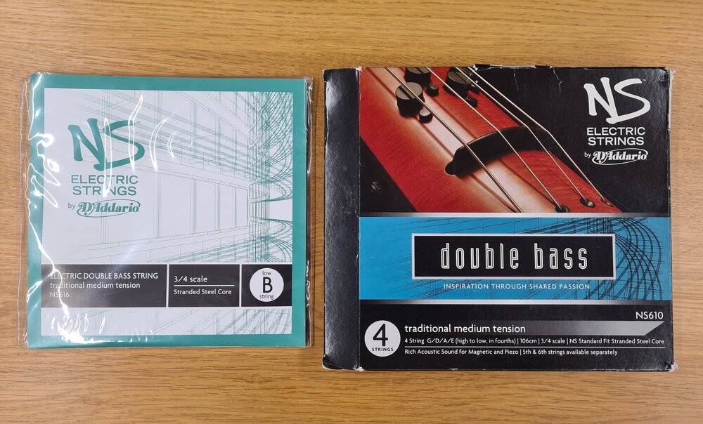 A new never used four-string set plus a B-string, so a five-string set. These are real double bass strings that can be played with a bow - not the thin, flimsy ones that come as standard with NS instruments. These are an upgrade to a real playing feel. New price for the set plus B-string is £216/245€. My price £100/110€ plus shipping.