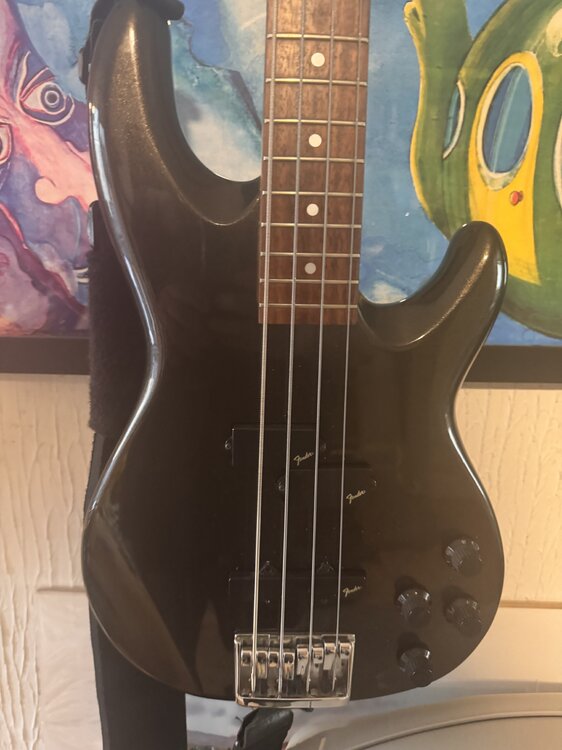 I've had this lovely metallic black 1998 Fender Lyte for a while now, but I rarely use it these days. Why so cheap? Well, at a rehearsal, the nut sort of literally exploded—I've never seen this happen before. When I tried to remove the excess nut, the top wooden part shattered into many pieces that couldn't be glued back together. I simply glued a larger nut in place that is functioning just fine, but as it is, I rarely use it, so I didn't bother going to a luthier. The bass plays well, though, and I used it at a recent rehearsal to good effect. It's lovely at 7.4 lbs; it's a 1998 model with the original Fender electronics and all the Fender knobs. I thought I’d try here and offer it as a bargain to the B/C community. £400 or trade for a Markbass M58R 2x10 or 1x12 Collection from Plymouth, or happy to discuss couriers at the buyer's cost.