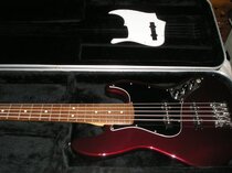 Beautiful condition 2001 Fender 5-string Jazz (MIM) in Midnight Wine (like a darker Candy Apple Red) with a replacement black pickguard. Strap pins are Schaller, but straplocks not supplied. Weight is around 4.6kg, and is nicely balanced (no neck dive). Note that this is passive, not the more common active MIM 5-string model. There are no discernable dings anywhere on it, and only a little play wear at the top of the pickguard. Lovely setup and action, with a new set of Elixir strings. Comes with the original (white) pickguard (virtually unused) and a Gator ABS hard case. These don’t appear often, so pricing is difficult but I’m hoping £525 (including postage) isn’t unreasonable.
