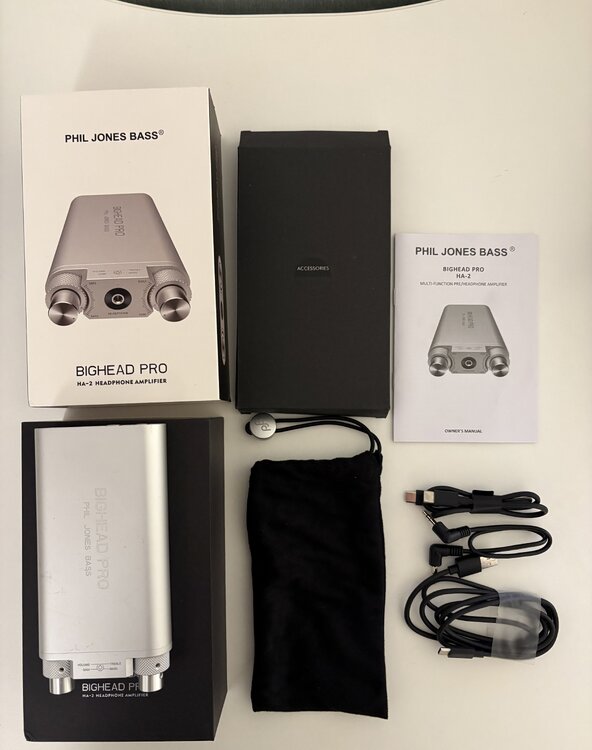 Phil Jones Bighead Pro HA2 for sale. Bought from new from Bassdirect and had it about a year I think. Looking for £200. Includes postage. I'm based in Cambridge. Here is some detail about the unit plus a photo or two and a link to a Youtube video. Mobile High Performance Multi-Function Headphone Amplifier/Digital Audio Interface The HA-2 is the second model in the Bighead series and is a step up model of the popular HA-1 Bighead with added technology and features. The HA-2 is a high resolution USB audio interface that supports PCM playback with up to 384 KHz sample rate/24 bit resolution. On DSD playback, sample rates of 2.822MHzand 5.644 MHz are supported, making it the ideal choice for musicians and engineers that desire high performance and the purest sound quality. It is a rechargeable lithium ion dynamo that is ideal for use in practice or recording situations. It also functions as a headphone booster amp as well as a preamp to drive powered amplifiers. The HA-2 has both passive and active instrument inputs with a 2 band EQ that is ideal for guitar and bass, yet versatile enough for use with other instruments. It has an internal lithium-ion rechargeable battery that is fed by its USB jack, so any computer or appropriate cell phone charger can charge it in less than 3 hours, but it can play for up to 8 hours. Model: HA-2 Power Output: 300mW/ channel, Headphone Impedance: 16-64 OHMS Frequency Response: 10Hz-40KHz Controls: Master volume, input gain, treble/bass for instrument input signal, headphone jack, line out, AUX input, micro USB for battery charge and digital interface Power: Internal lithium-ion Rechargeable Battery or USB Power Dimension: 3” x 5.9” x 0.9” (WxDxH) Weight: 0.6lbs / 290 g Other: Includes soft bag, stereo signal cable, and micro usb cable