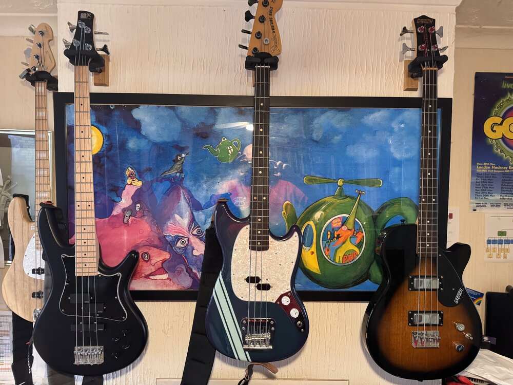 In a bid to withdraw my Sandberg 5-string superlight that I currently have up for sale, I've decided to clear out a few shorties to replenish my wife's idea of a 'music only credit card' that deserves to be played more than I'm managing to. All fully working, all gig‑ready, and all great examples of their type, more pics available on request. 1️⃣ Ibanez Mezzoo 32" (Upgraded EMGs + BTC System) — £250 (Left on pic below) A cracking medium‑scale Ibanez Mezzoo, upgraded with EMG's and BTC. Specs & highlights: 32" scale EMG pickups + EMG BTC active EQ system Custom removable black plastic wrap on the pickguard cover for that overall JJ Burnel vibe — white marble underneath if you prefer the original look Black/maple aesthetic looks superb Low action, plays fast, sounds huge Only 7.7 lbs A lightweight, punchy, modern shorty with proper upgrades, plays really nicely. --- 2️⃣ Fender Mustang Vintera II '70s Reissue — £700 (Middle on pic below) (or £750 with Gotoh Ultralite tuners fitted) The star of the show. Traded locally after Xmas from someone who had just bought it new. lovely bass! Specs & highlights: Vintera II 70s reissue 30" scale Colour is officially "Burgundy", but in person it's a gorgeous blue with a subtle red tinge in the light. Gotoh Ultralite graphite tuners fitted (shaved ~7oz off the weight) Add £50 if you want them left on, otherwise originals will be refitted Currently strung with DR Bootsys — will include a set of chrome flats Around 8 lbs Sounds exactly like you want a Mustang to sound: warm, punchy, characterful A genuinely lovely example, immaculate, — the one I'll miss most. --- 3️⃣ Gretsch Electromatic Short‑Scale — £175 (Right on pic below) A great‑sounding, warm, thumpy Gretsch short‑scale. Used, historically gigged, and with a few honest knocks to show for it, but fully functional and still a vibe. Specs & highlights: Classic Electromatic short‑scale tone 30" scale A few cosmetic marks from age and gigs Around 8.6 lbs Perfect as a first shorty, a mod platform, or a reliable backup. Location & Shipping Collection: Plymouth Courier: Around £20 within the UK Happy to answer questions or take more pics.
