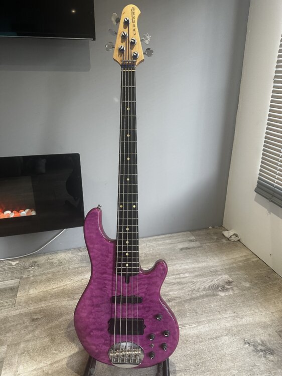 Up for sale is my absolutely stunning 5 string 2020 Lakland Skyline 55/02 in trans purple. It has an ash body with beautiful quilted maple top, an ebony fretboard on a flat-sawn maple neck with graphite reinforcement bars. This bass is in excellent condition, it’s been gigged but has been very well looked after and there’s no obvious damage - it’s just not a brand new bass, I’d say it’s 9/10 and can’t find anything specific to note that’s negative about it 35” Scale with a 1.81” nut width, 22 fret with a radius of 10-13”. It is strung with Sadowsky blue label nickel 45-130T’s with the Tapered B string, so the combination of these strings and the Lakland neck gives this bass one of the best sounding B strings you could ask for. Pickups and preamp are both Lakland’s own LH3 which are in both the U.S. 55/94 and 55/02’s as stock. The preamp is Vol/Blend/Treb/Mid/Bass (cut and boost), however you can open the control panel in the band and change the frequency of the Mid control using the dip switches (275/600/900/1100hz). There is also a coil tap for the bridge humbucker pickup - towards the neck and engages the front coil only (60’s jazz) mid position is the full humbucker (both coils - stingray mode) and pointed towards the bridge is rear coils only (70’s jazz). The front pickup only also does a pretty convincing P Bass sound for a bass that’s clearly not a P Bass making this one of the most insanely versatile basses you can get - it’s extremely hard to get a bad sound out of this (trust me I’ve done my best! 😁) Included in the sale is an almost new ‘Protection Racket’ gigbag and Shipping via DPD Next Day (within the UK). It’ll be extremely well packaged and boxed so it’s safe for the journey, or collection from DH2, County Durham is also welcome Priced for a quick sale, no trades and no offers - this is a superb quality bass, at a very good price. Thanks for looking £875 shipped