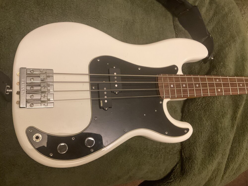 I've decided to put this Jazz up for sale. It's a great bass but I've decided to look for a real late '70s Jazz. It's a 2017 Fender Japan '70s traditional Jazz Bass in California blue finish. It's an authentic recreation of a late '70s Jazz. The body is ash and the neck is one piece maple with a skunk stripe. It sports full size Japanese Gotoh tuners and the normal Fender bridge. A lot of these Japanese '70s Jazz recreations use '60s spacing for the bridge pickup, but this has the correct '70s spacing and 7.25" vintage radius. This model is not available anymore - the current iteration has a basswood body, smaller tuners and a 9.5" radius A previous owner has customized it somewhat; the white pickup covers and knobs are not original - it would originally have had black ones. I do not have those unfortunately. The body is light swamp ash - the bass weighs 4.2kg/9lbs 4oz. It comes in a fairly lightweight gig bag. The neck is in ideal condition with no marks/dents at all - like new. The body has some dents in it but the paint is all intact. Truss rod works fine, it's currently set up with a very low action with 45-105 Elites Stadiums. I'm in Bristol and you're very welcome to try it out through my amps. Collection preferred - I do not want to post it given the fairly basic gig bag. Happy to drive a reasonable difference for the right buyer however. The only trades I would be interested in would be either a genuine USA '76-82 Jazz, or a 2 band StingRay, with money added from me your way obviously.