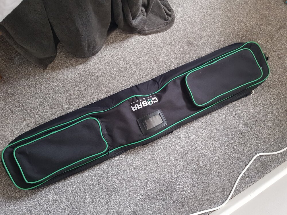 Cobra mic stand bag for two mic stands. Two pouches for mics, leads, weapons etc Handle and shoulder strap Very well used - it's tatty and the zip only works one way... it's marginally better than no mic stand bag Yours for the cost of postage - if it's less than £7, I'll refund the difference My lovely fluffy blanket is not included