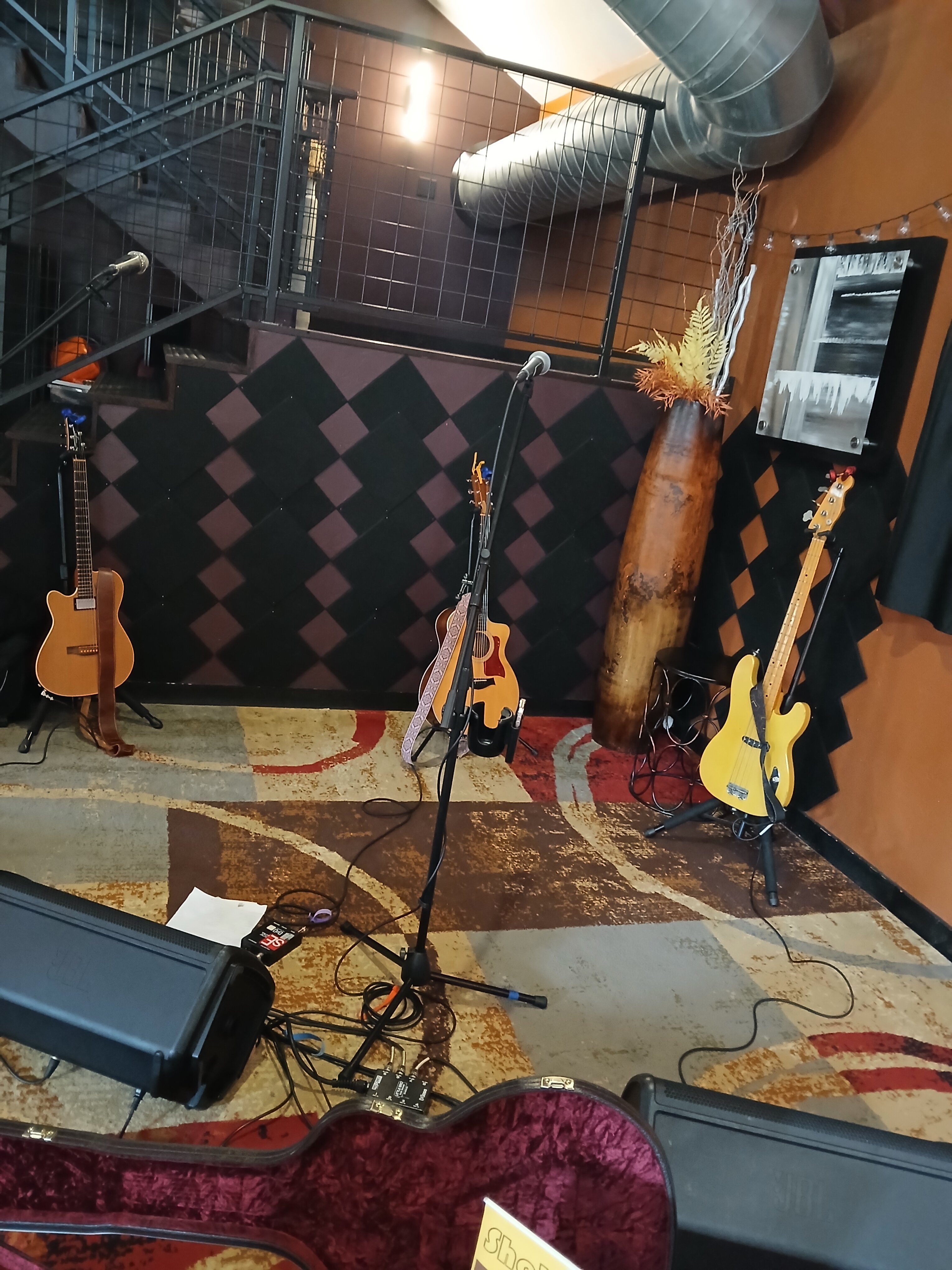 stuck at the end of an already small room….check, next the the ladies loo so you have to move out of the way…check, PA speaker on top of bass cabs…check, footie on even after we start…check,loud, social but uninterested crowd…check. Added plus to sit on the floor because no chairs are available during break….