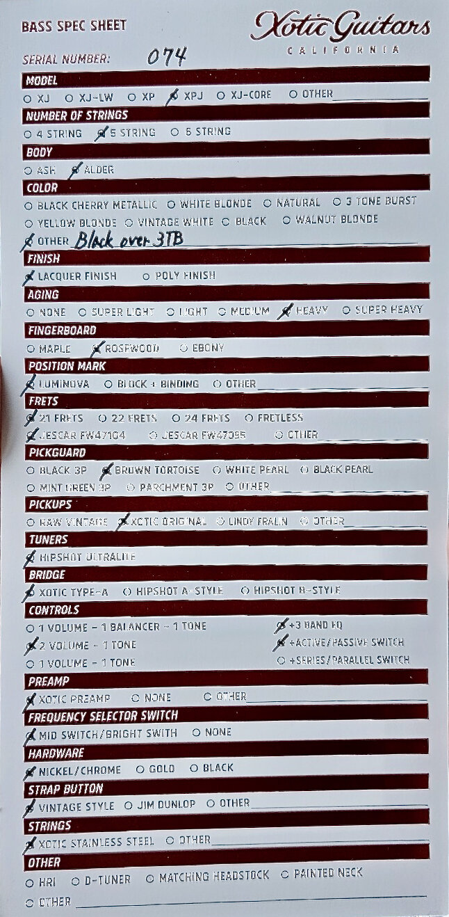 Hello, up for sale is this very nice and rare Xotic XPJ-1T 5-string in Black over 3-tone sunburst color. This bass is not a standard production model, but it was custom made like custom order  (includes many premium features) by Xotic Guitars in Japan.