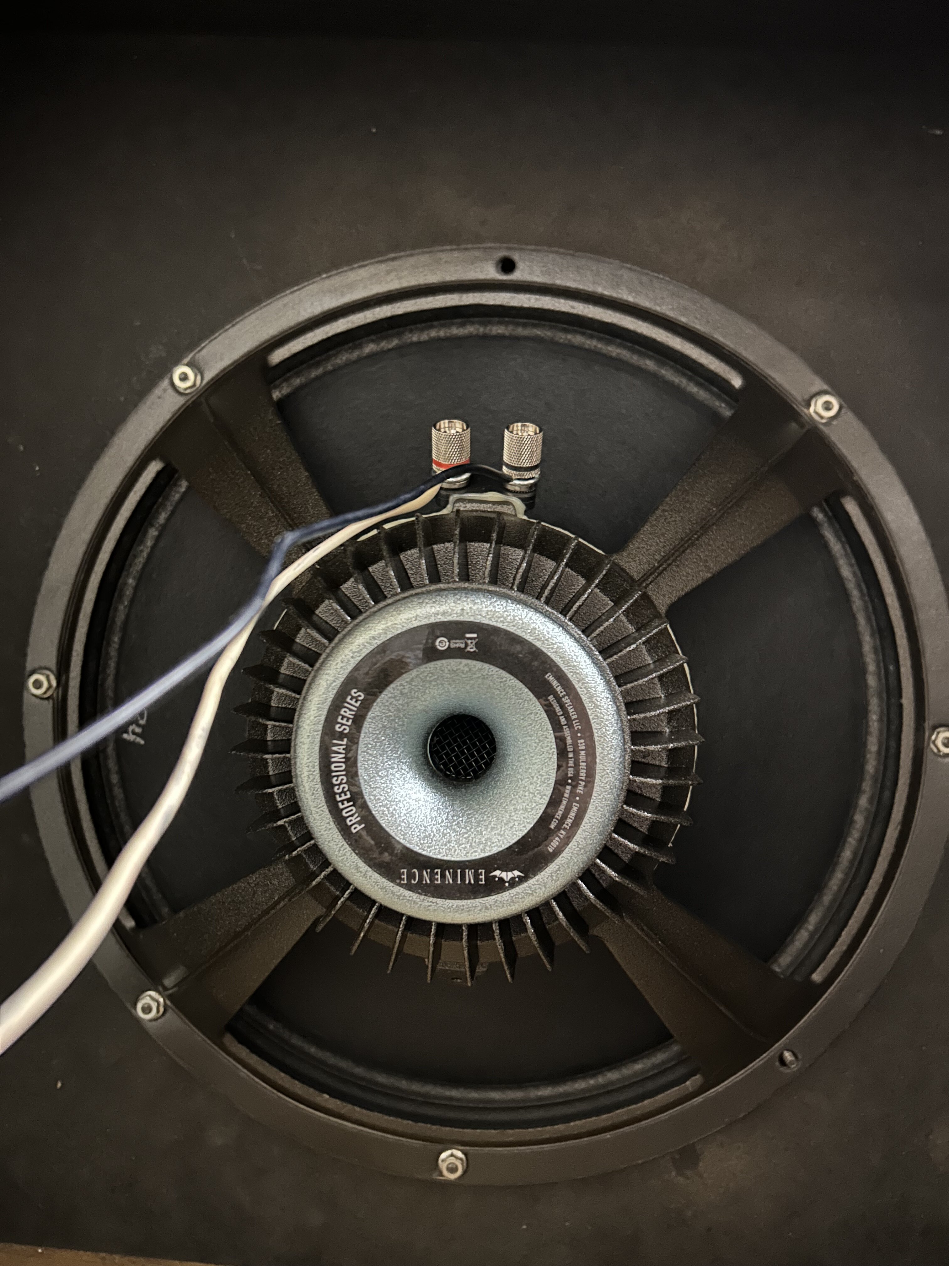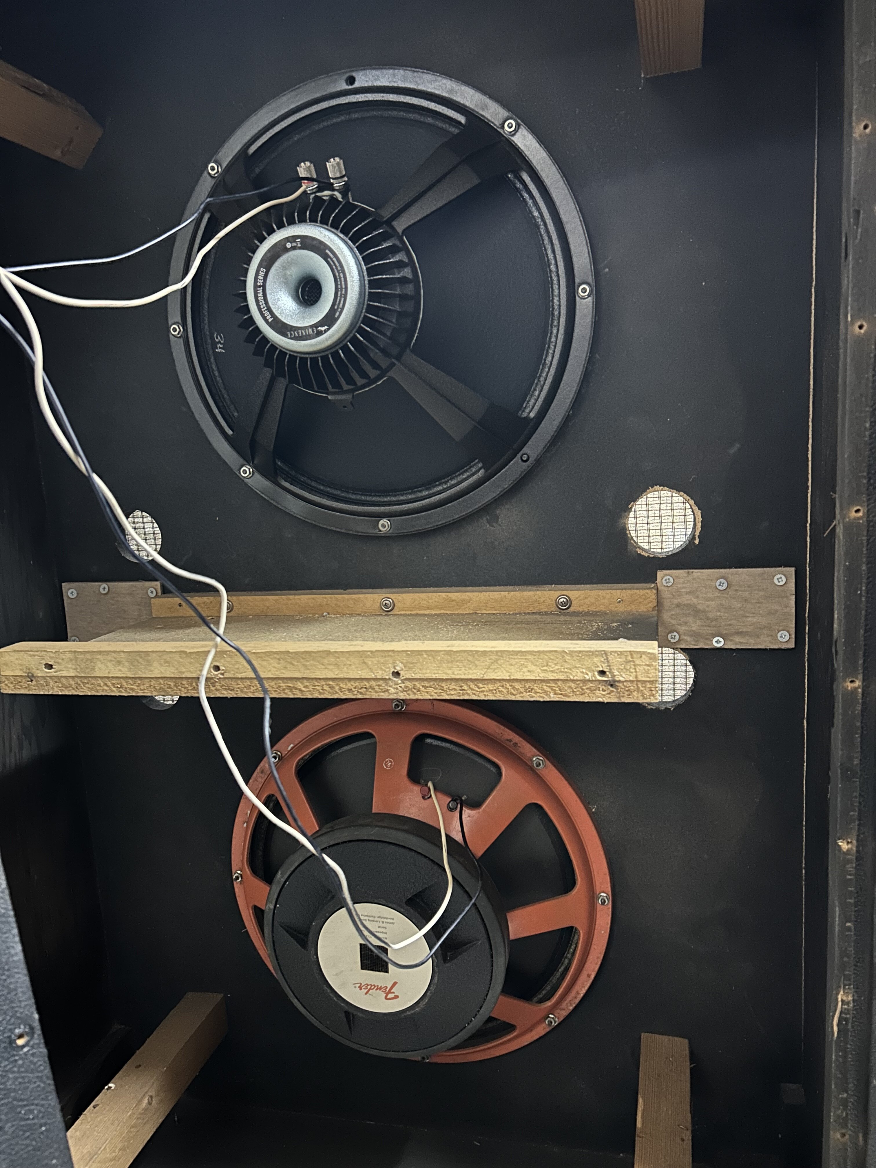 wallyp Posted 1 hour ago Posted 1 hour ago Hello All Purchased this beast from a shop that was closing down for the princley sum of £15. Nearly put my back out loading it into a pickup. I bought the top speaker, an Eminence DELTALITE II 2515 NEO 8ohm 15" 300watt as the original was ripped. I have a Dual Showman Reverb and a Fender J Bass I'd like to use with it. Mostly neck pickup with tone off. My question, as a complete newbie to cabinet design, is can I get this to a useable state? And what should I be priortising? Its looks like somebody has closed a couple of the front open 'ports'. Should I be closing the rest off? Closed back? Acoustic matting? Create new ports? Seperate the two speakers with baffles? BTW low G to Open E farts like a good un. Quote