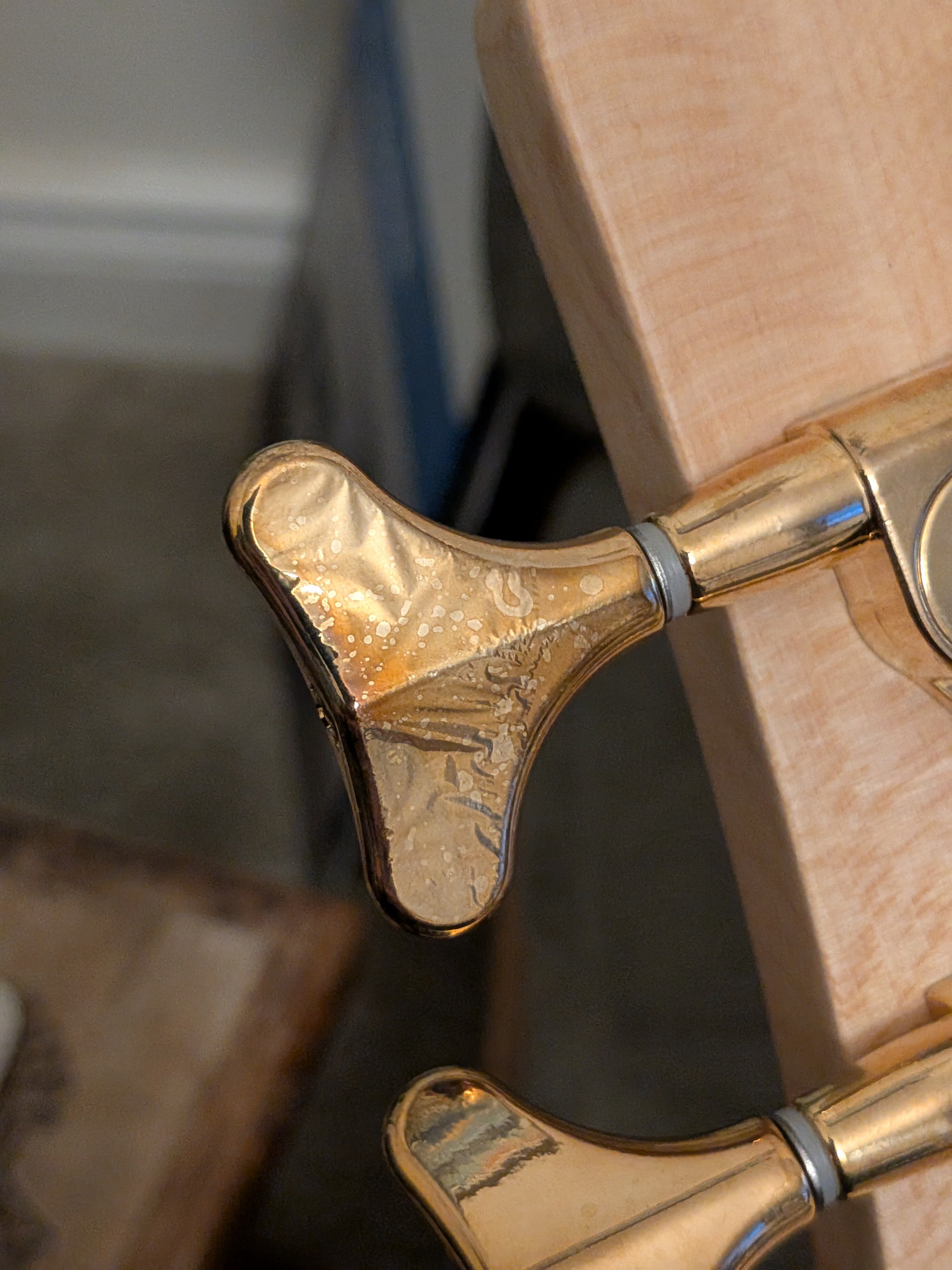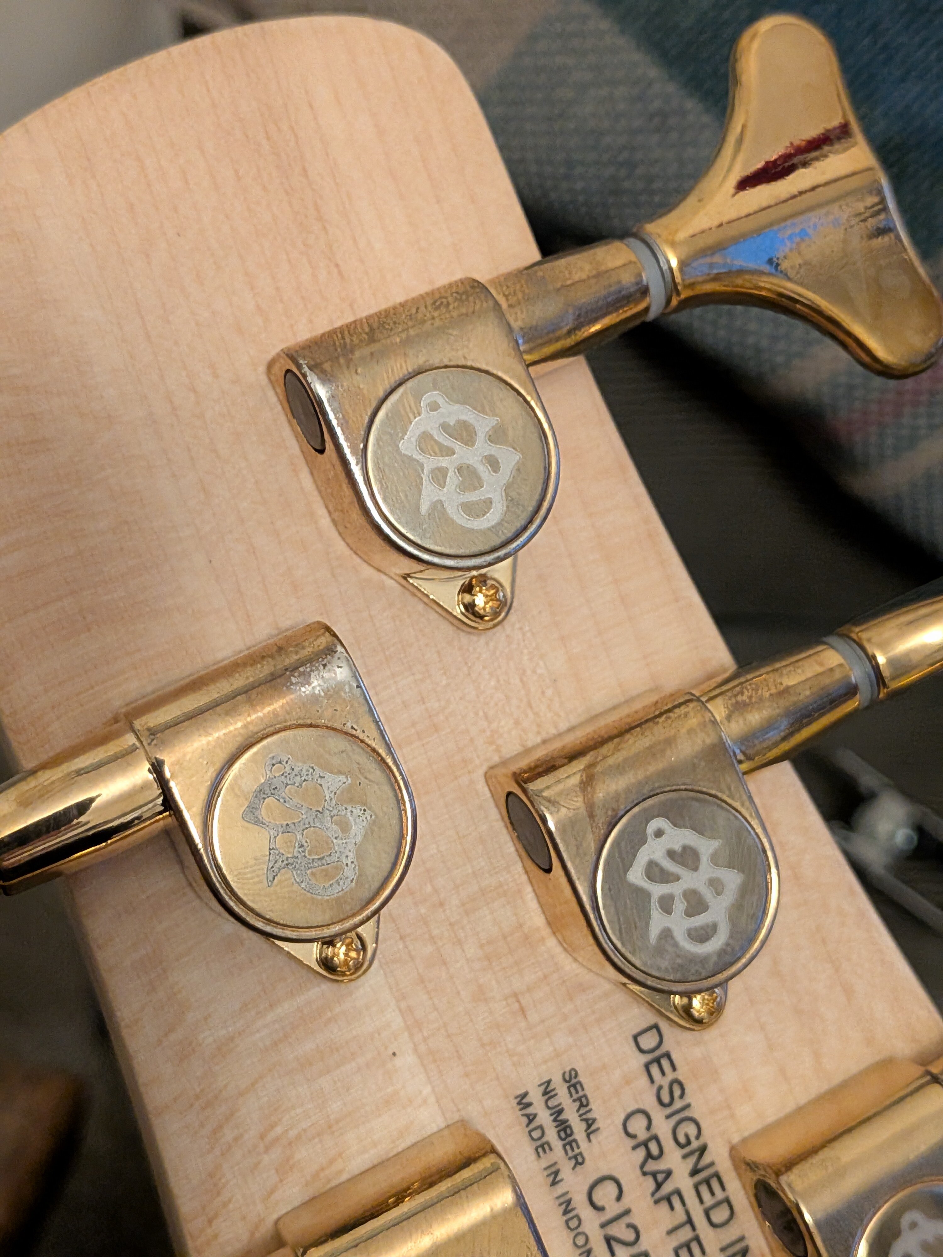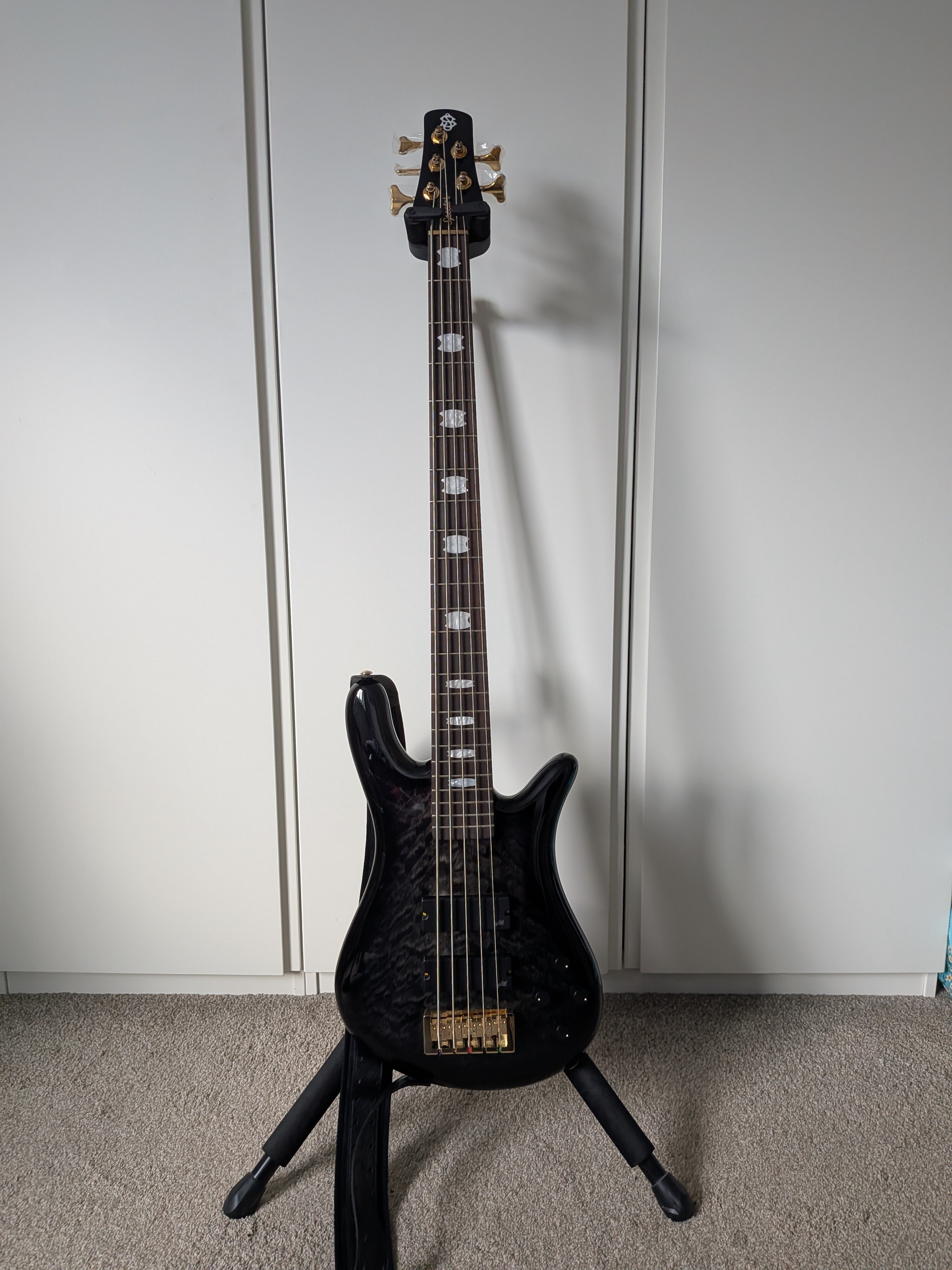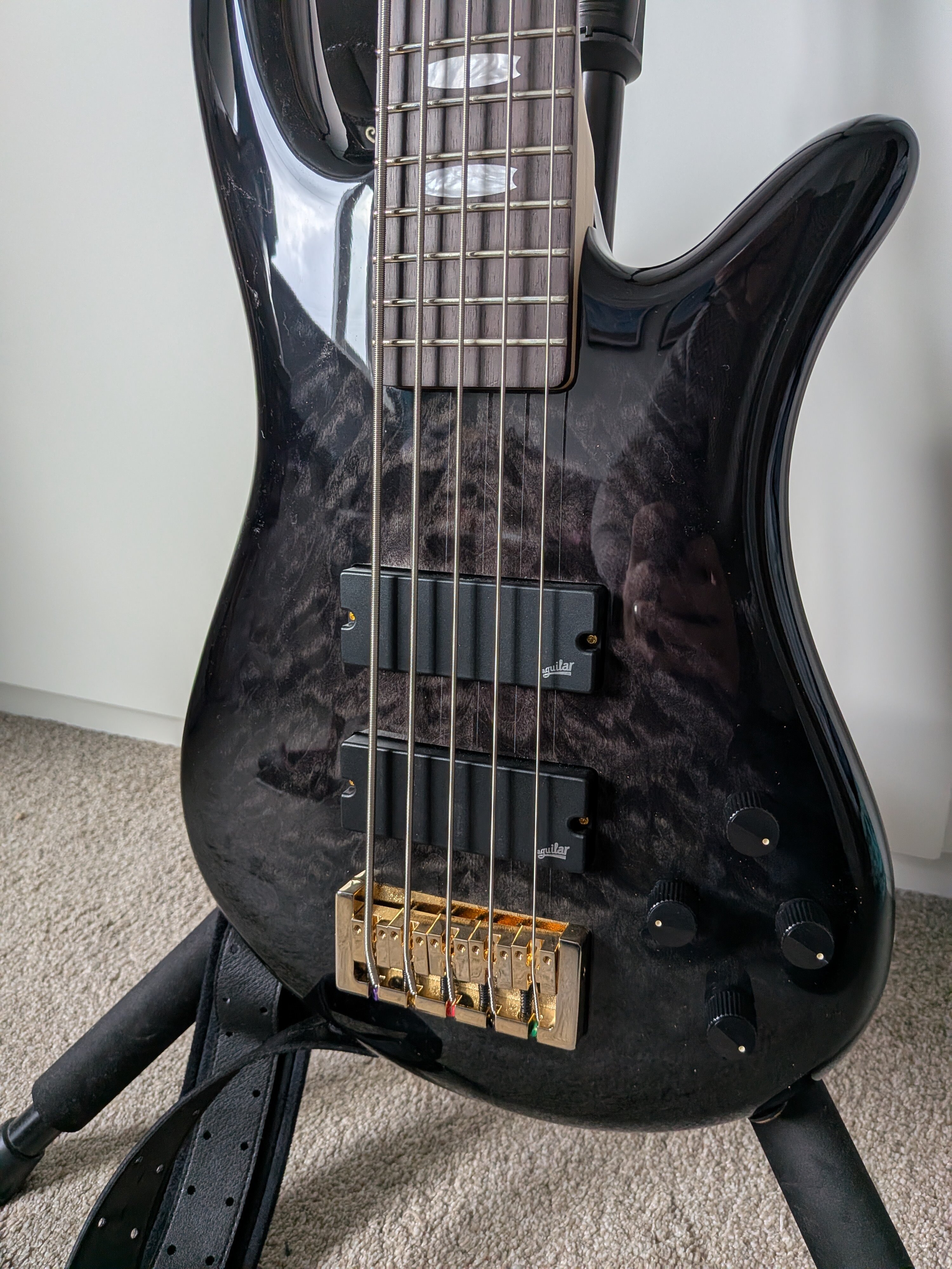 MichaelDean Posted 4 hours ago Posted 4 hours ago (edited) This lovely instrument turned up on Monday. The finish is just great. In a dark room, you wouldn't know it wasn't black, but the quilt veneer just peeps out at you. The NS shape is super comfortable too. The neck is fairly chunky, but not too wide - I'm finding it to be very comfortable. And the rosewood fretboard is very dark and even. It does make me wonder if it has been dyed. Very harsh edge to the fingerboard, but that should soften with use. Nice and light at 3.87kg/8.5lbs but a little bit of neck dive. I think some Ultralights or Gotoh GB350s would be just the ticket to sort that I reckon. It isn't bad with the lightly grippy RightOn strap I got at the same time. The tuners arrived in a sorry state though. There was a scuff on the back and a bubble under the gold plating on the D string tuner. Thankfully, @Bass Direct have ordered me some replacements (thanks!), so I'll get those on when they and my custom Newtone string set arrives. It sounds great. It's very mid forward which is new for me. I'm used to having to add them in with my Dingwall. The boost/cut range on the preamp seems to make a fairly huge difference. For my use I think just some subtle movements are what's required. The Aguilar pickups seem to be nice and clear too. I'm not a bridge pickup person, but the blends are all very useable. It's nice and even sounding across the neck though and nicely resonant. Other than the tuners, which will be sorted in due course, I'm very happy! Edited 4 hours ago by MichaelDean 3 Quote