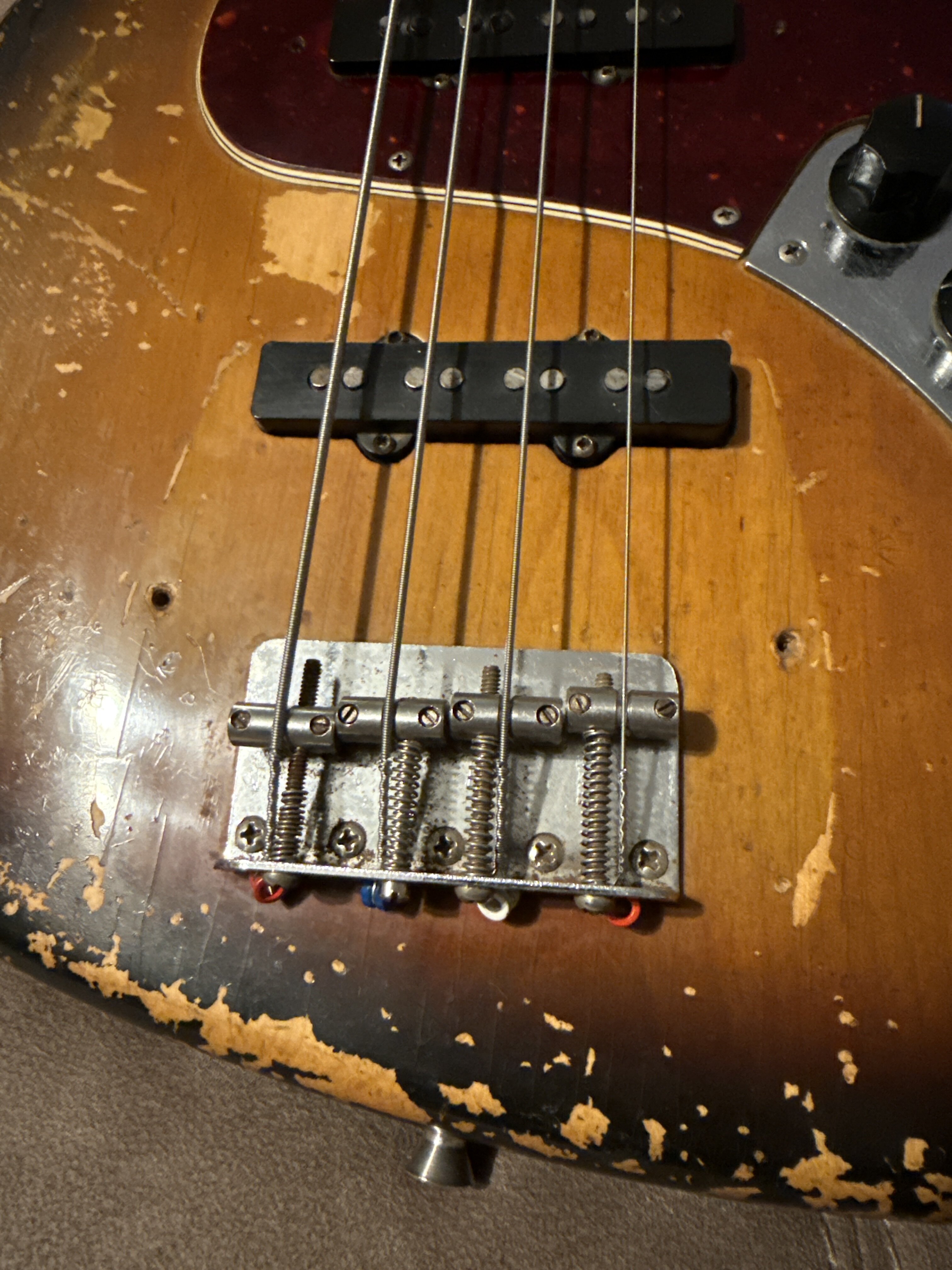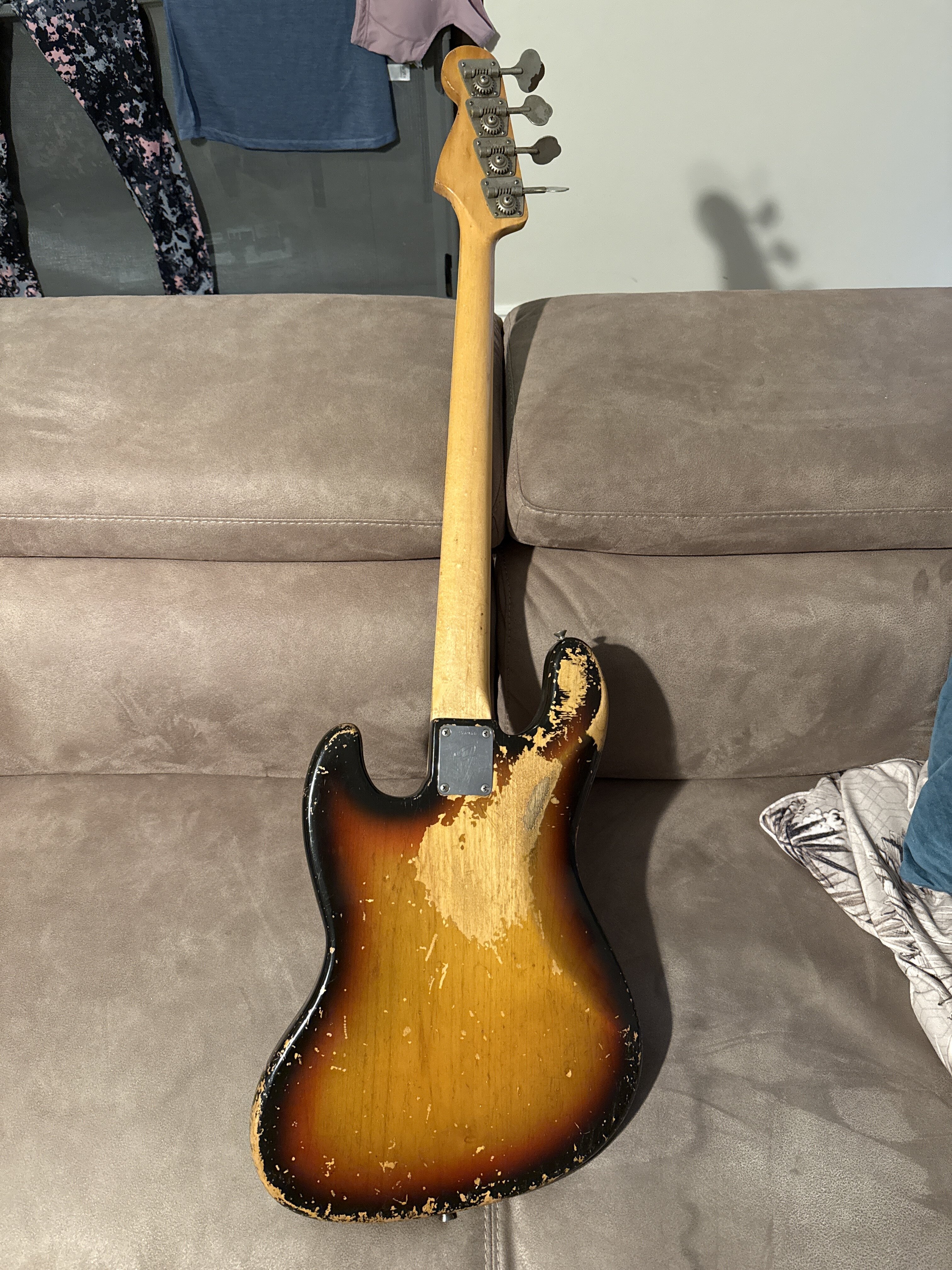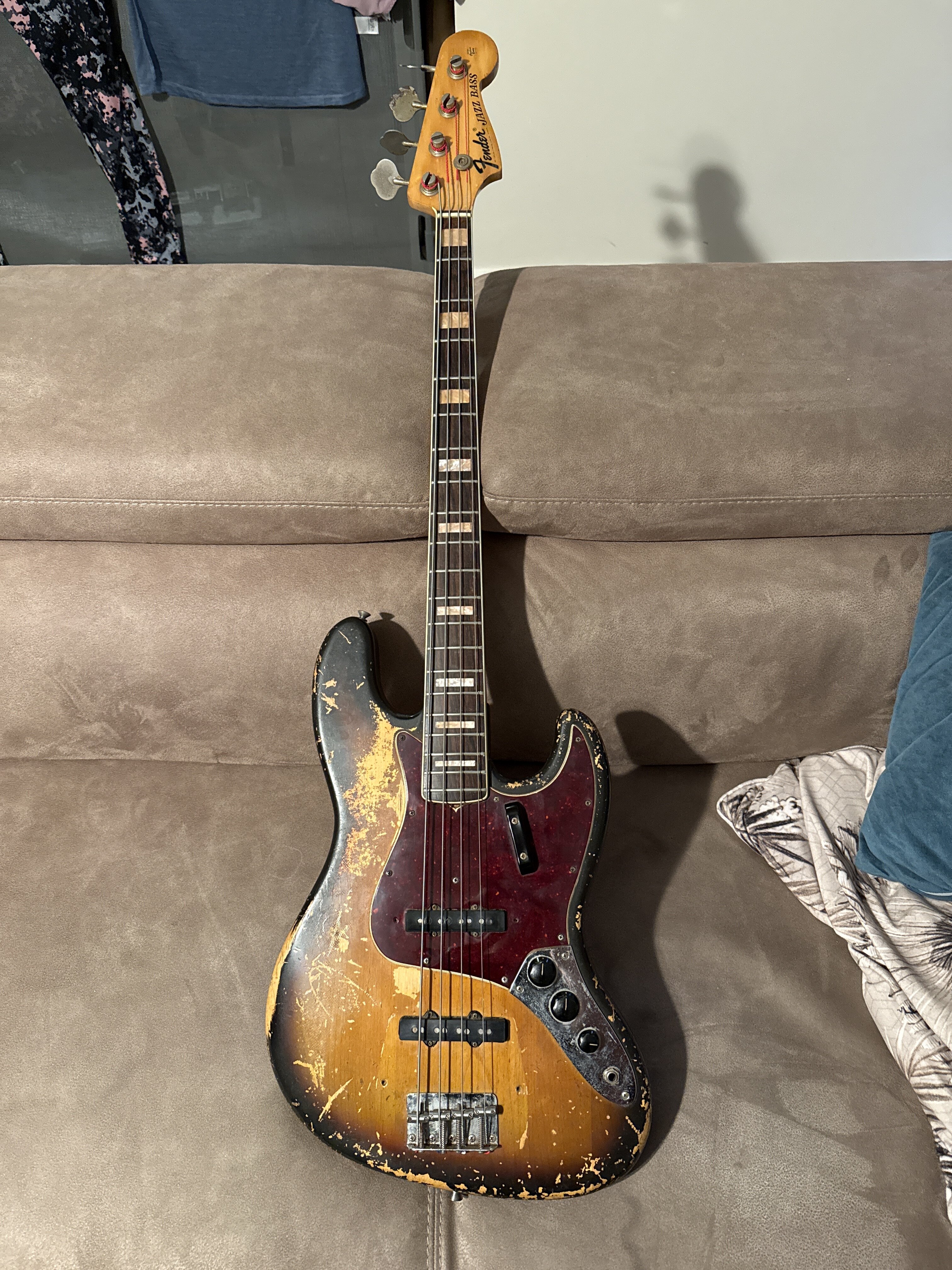 Higgie Posted 1 hour ago Posted 1 hour ago (edited) Hi all - selling this for a family friend. If you are a collector looking for a time capsule bass, this is NOT it. It’s been played to hell and back and it looks like it! It’s an almost all original 1969 Jazz bass. Body, neck, pickups, tuners, pots, bridge ashtray, frets* all original. It sounds GLORIOUS - exactly that sound you think of when you think of a 60s jazz bass. It’s lovely and light and resonant, and with some TLC will be a fantastic instrument - I wish I could afford to buy it, I really do! Here’s what is NOT original: - A single intonation screw on the bridge - output jack - truss rod nut - 1 strap button *It’s in serious need of a re-fret, which is reflected in the price. Can take more pictures if required. Edited 1 hour ago by Higgie 2 Quote