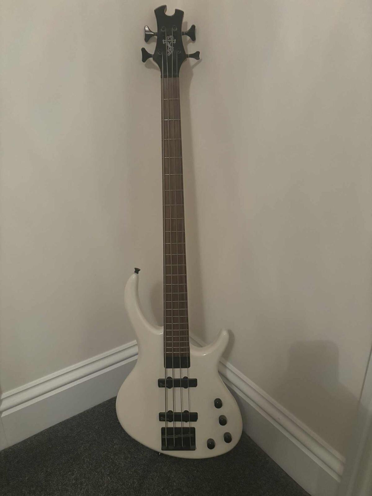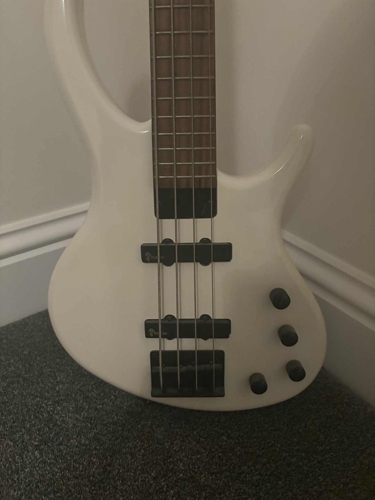 funkydoug Posted 1 hour ago Posted 1 hour ago (edited) Selling this on behalf of a friend here in Northumberland who bought it to learn but decided to stick to lead/rhythm guitar. Really clean condition. it is a white Toby by Tobias bass, manufactured by Epiphone. Manufacturers blurb: ”Tobias designed single coil pickups with volume, pickup blend, neck eq and bridge eq controls. Radiata ergonomic body Hard maple neck Bolt-on neck, extended with recessed bolts/washers 34 scale Rosewood fingerboard 12" Fingerboard Radius 1.68 nut width Tobias TBT Single-Coil bridge pickup Tobias TBR Single-Coil neck pickup 1-High Frequency EQ, 1-Low Frequency EQ Flush-mount, low-profile, fully adjustable bridge Metal, fully adjustable truss rod” Collection or local meet / delivery preferred. £250 Edited 1 hour ago by funkydoug Quote