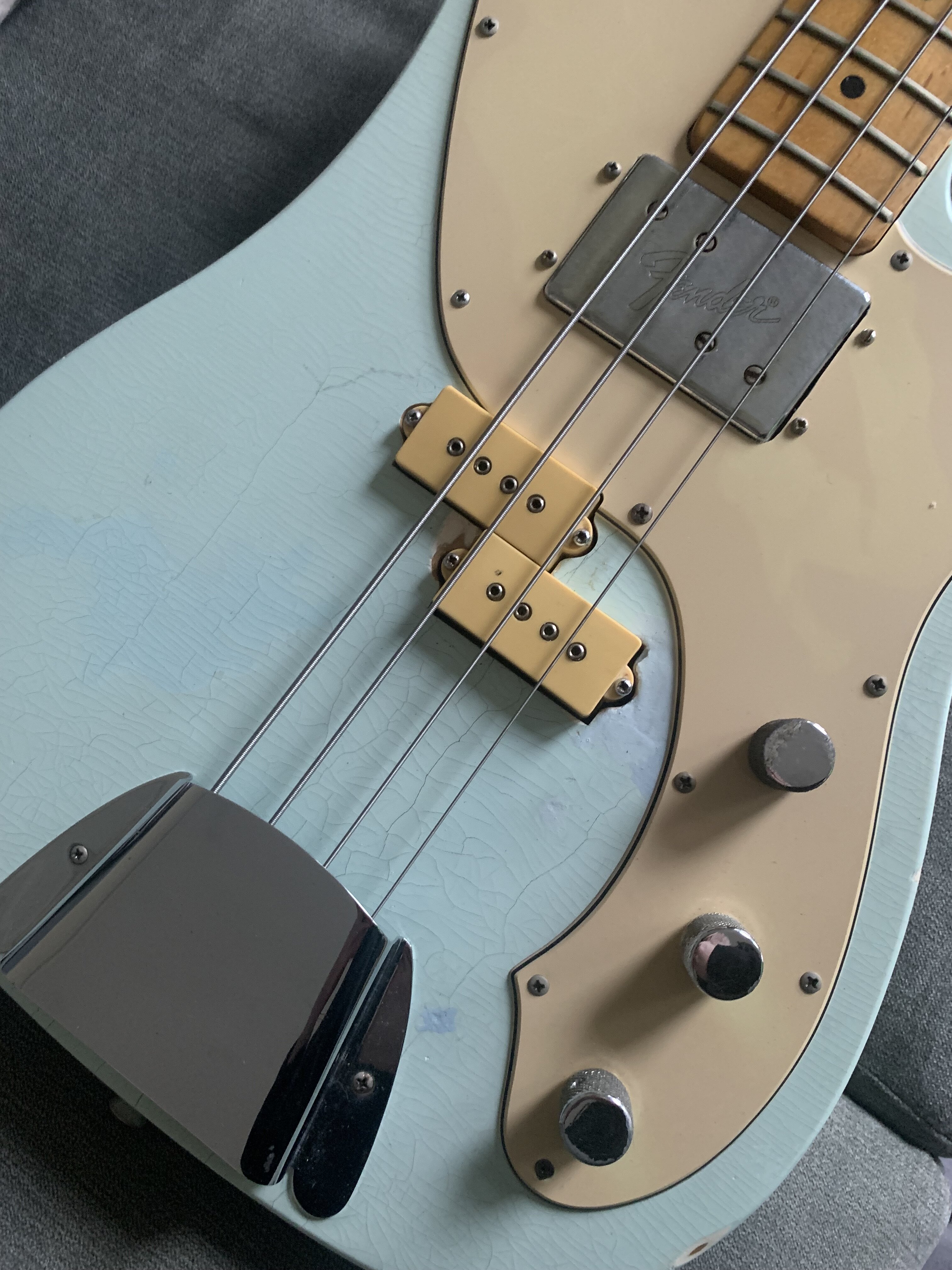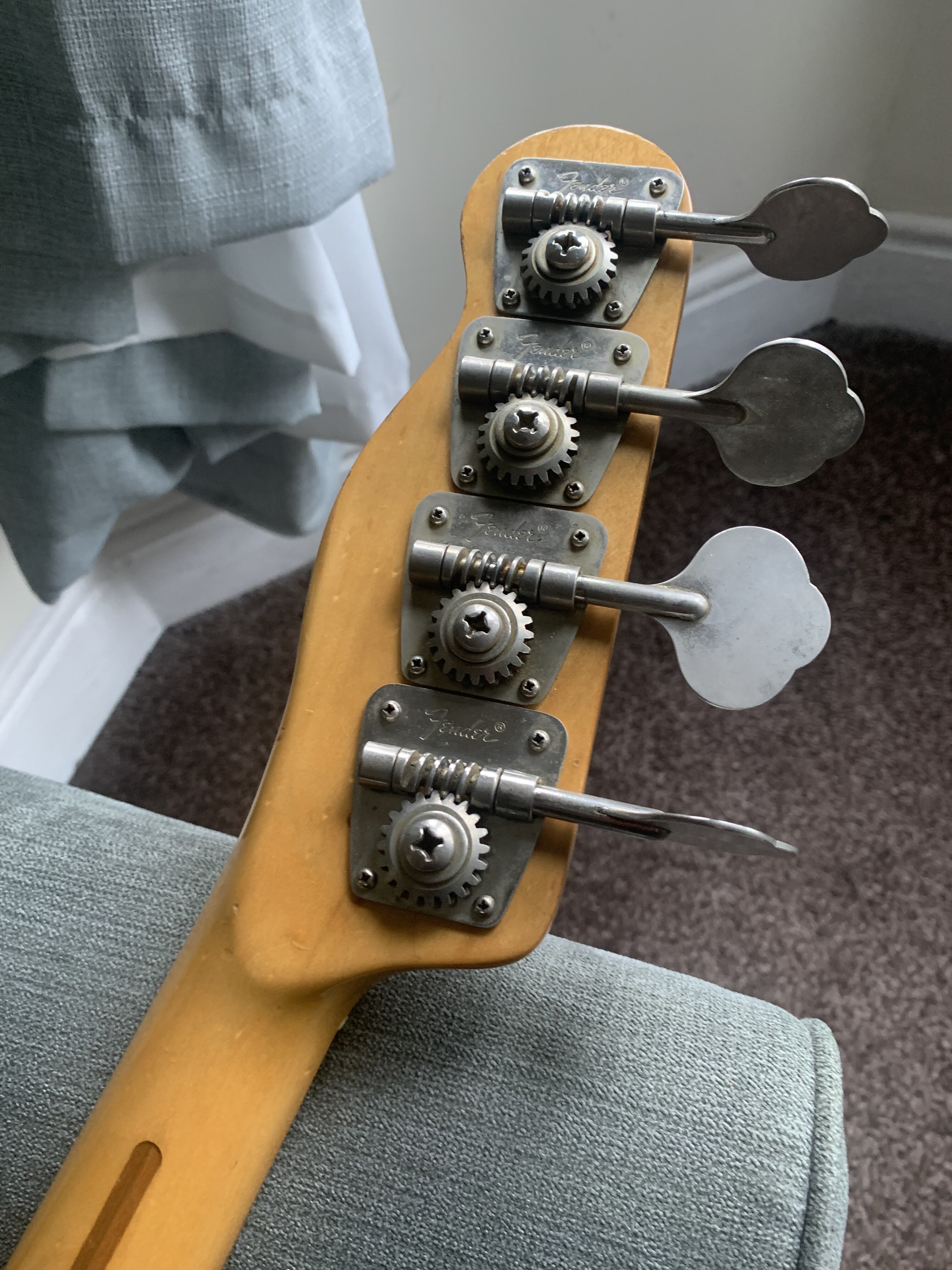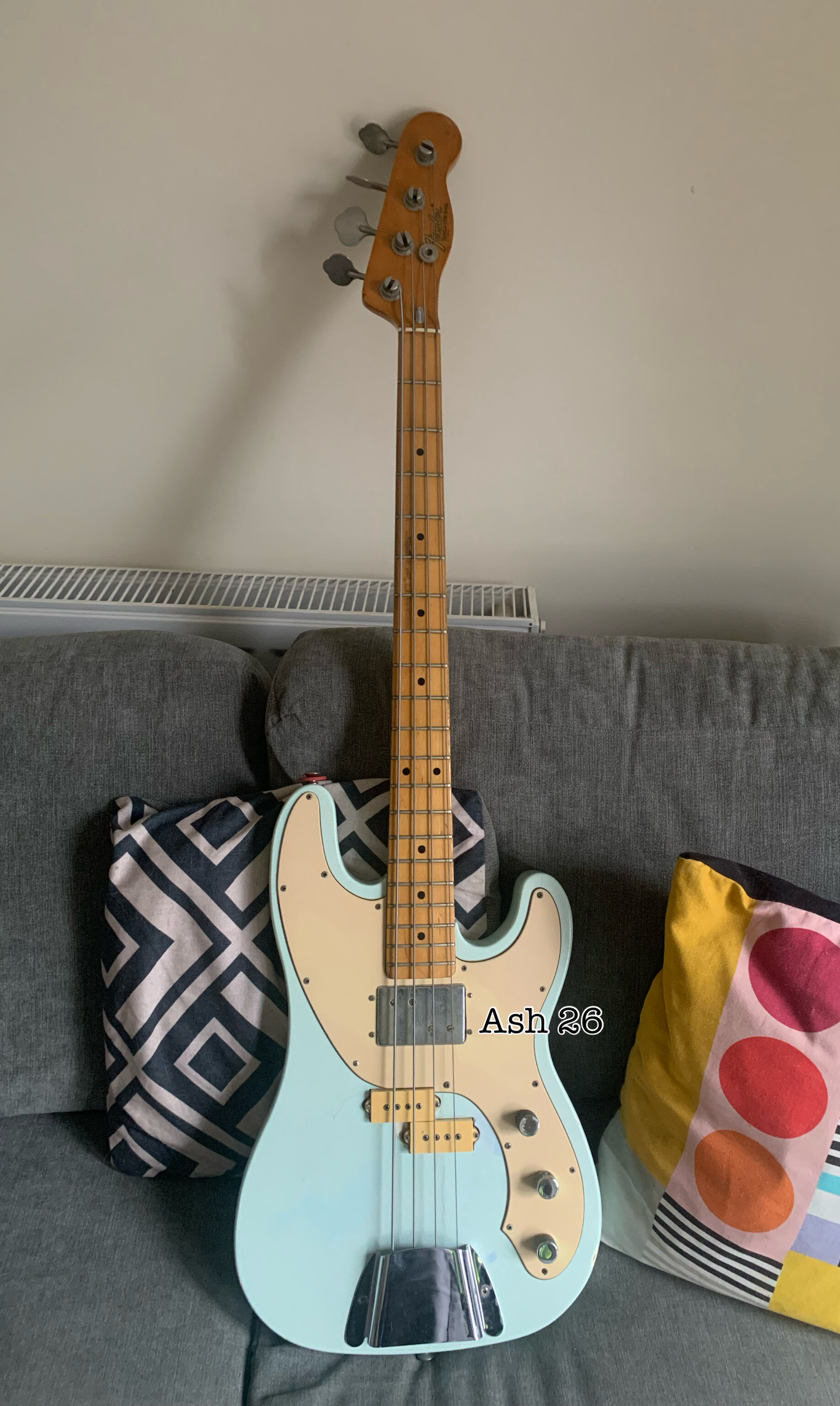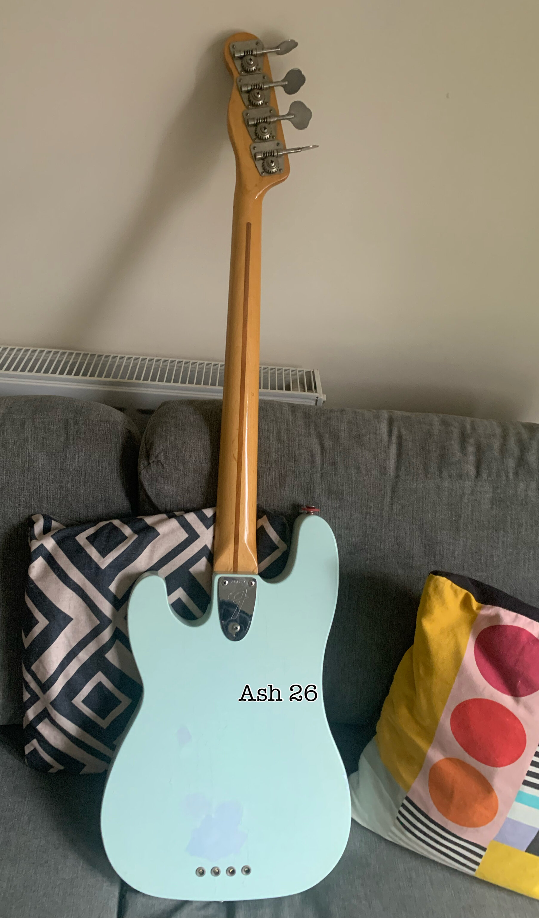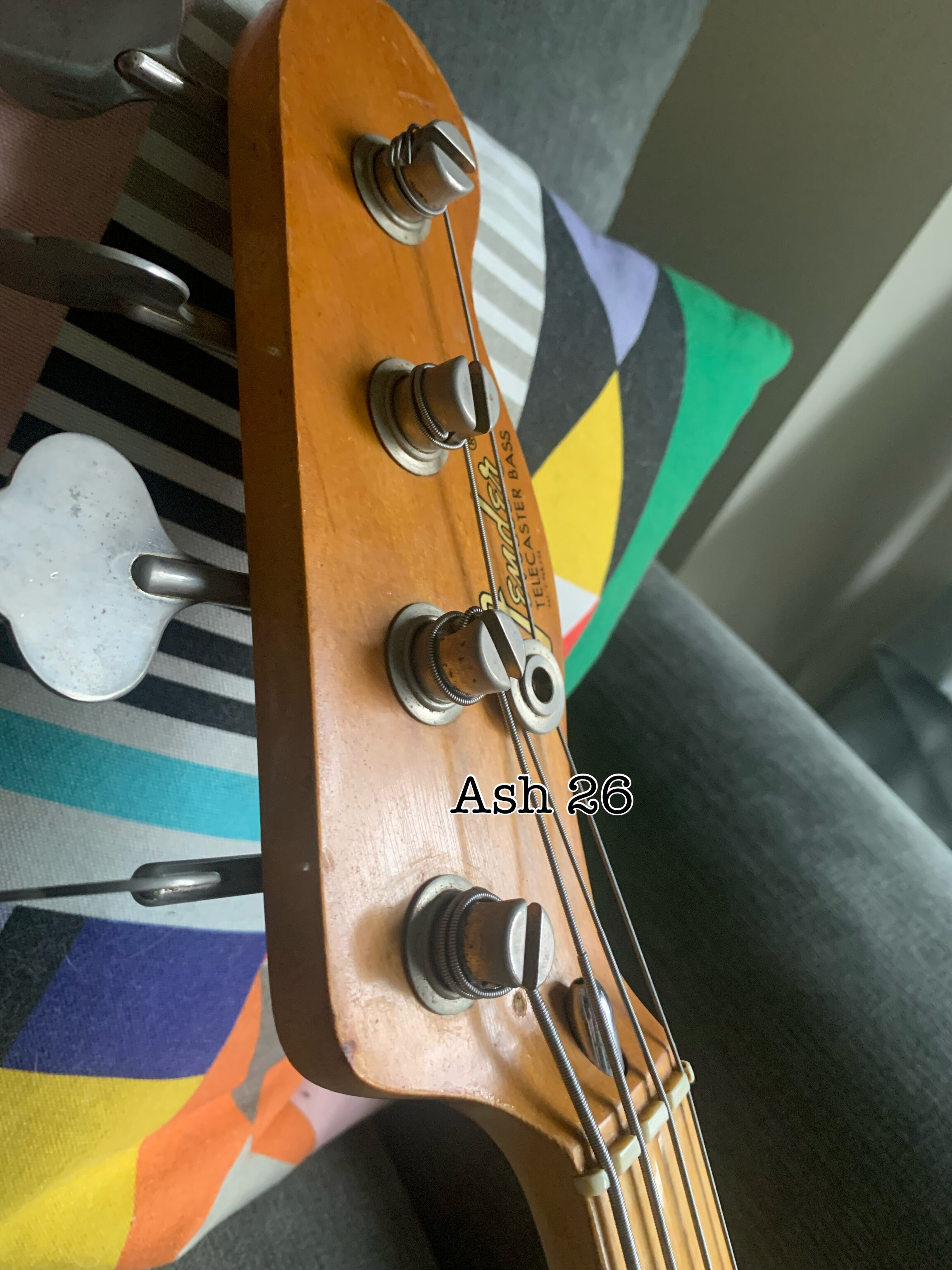 ash Posted 1 hour ago Posted 1 hour ago This is more of a feeler to see if there is any interest. My old Fender Telecaster Bass dates from 1972. The Basschatter who I got it from had the P bass pickup routed and the body refinished by John Diggins. When we exchanged it a few years ago it didn’t have the original Fender humbucker however I managed to source an original which I imported from the US. I added an extra original volume pot from the same era and sourced a 70’s Fender knob. It is wired like a Jazz bass two volumes and one tone. It has the three bolt neck with working micro tilt and a working bullet trussrod. The original finish was natural as there is a stamp under the mudbucker. The tuners, neck , frets and body are all original although I’m not sure of all of the pots and definitely not the wiring. The bridge had been swapped for a four saddle top loader job so I got a two saddle through strung with saddles that can be angled. More in keeping with the original but easier to intonate. The P bass pickup is a cream coloured late 70s vintage Dimarzio DP that sounds fantastic. The big humbucker has real sub bass to it and there are some classic tones to be had between the two. The Diggins refinish is intentionally worn with crazing however there are areas where the routing was rough that have been filled and touched up on the front. There is a larger buckle rash area on the back also touched up rather clumsily as the colour match is very poor. It protected the wood at least! My original intention was to take it back to a natural finish but I’ve not got round to it - as usual…. The scratch plate is a copy of some kind, when I got it the bass looked more like a Mike Dirnt Tele. My luthier cut out the area for the Fender humbucker. The ashtray is original and you can see the remains of the perished rubber mute on the inside of it. The bass plays well and is strung with Elixir coated strings. It is quite hefty but nothing like some of the Tele basses or other basses of this era I’ve played. It is around 4.7kgs. The bass in an earlier incarnation is pictured and described in the Haynes Fender Bass Manual. It’s a players bass rather than one for the collector. It could be restored to the original spec if you really wanted to but you’d have a one trick - albeit a good trick - pony. I’m reluctant to shift it but my P bass isn’t selling and having had some large vets bills recently I need to free up some cash. It is a rare opportunity to buy one of these old Telecaster basses at a sensible (I hope you think so too) price. Pickup preferred but I can post in the UK at cost. Sorry no trades. There isn’t a case with it but I’ll try and source one if you want it posting, otherwise it comes with a Fender gigbag. I’ll be sad to see this one go. I’ll add more pics if required. All the usual ID stamps are on the neck heel and pocket I would rather not remove the neck as they are a faff to set up with the micro tilt. 8 Quote