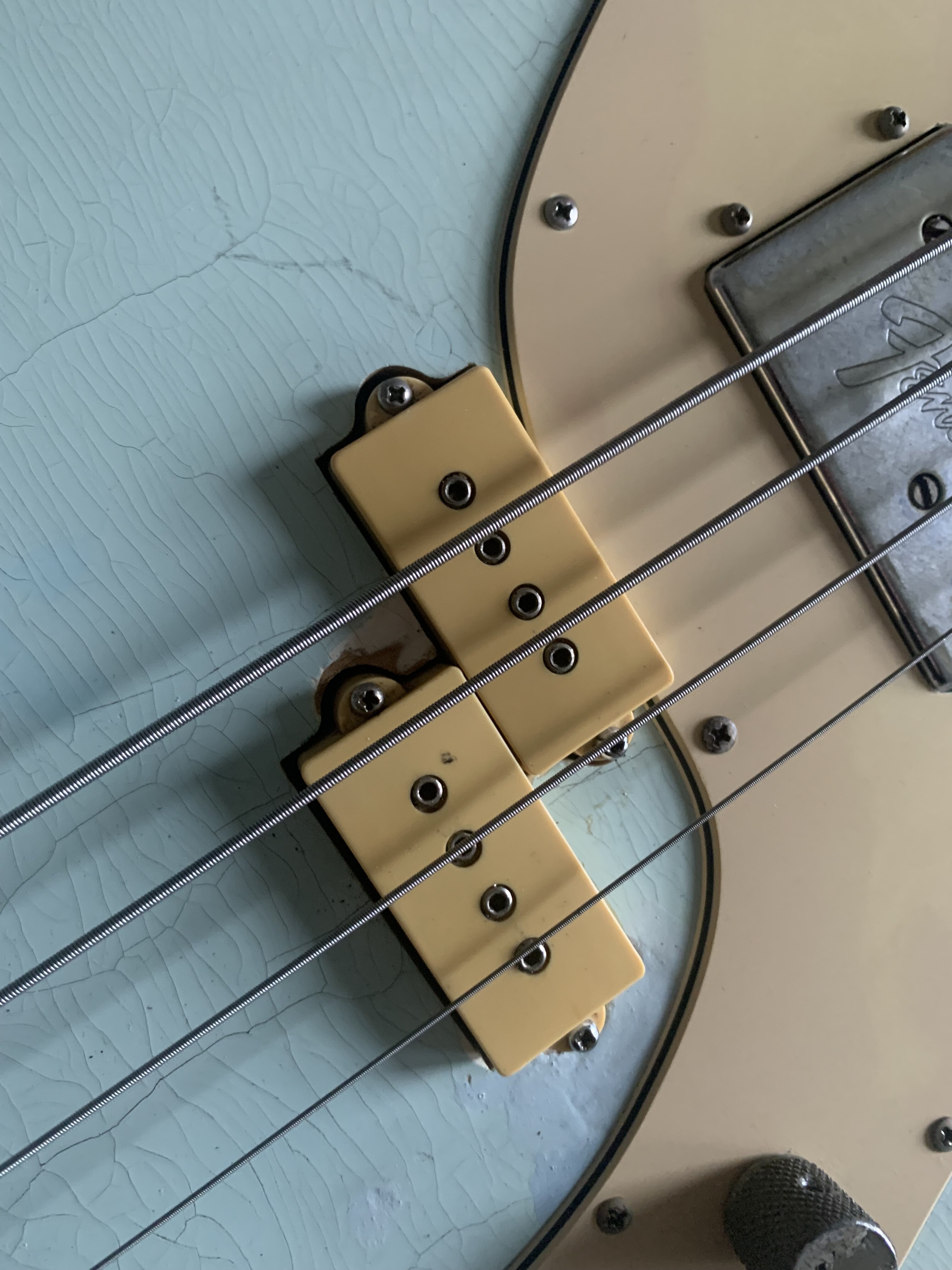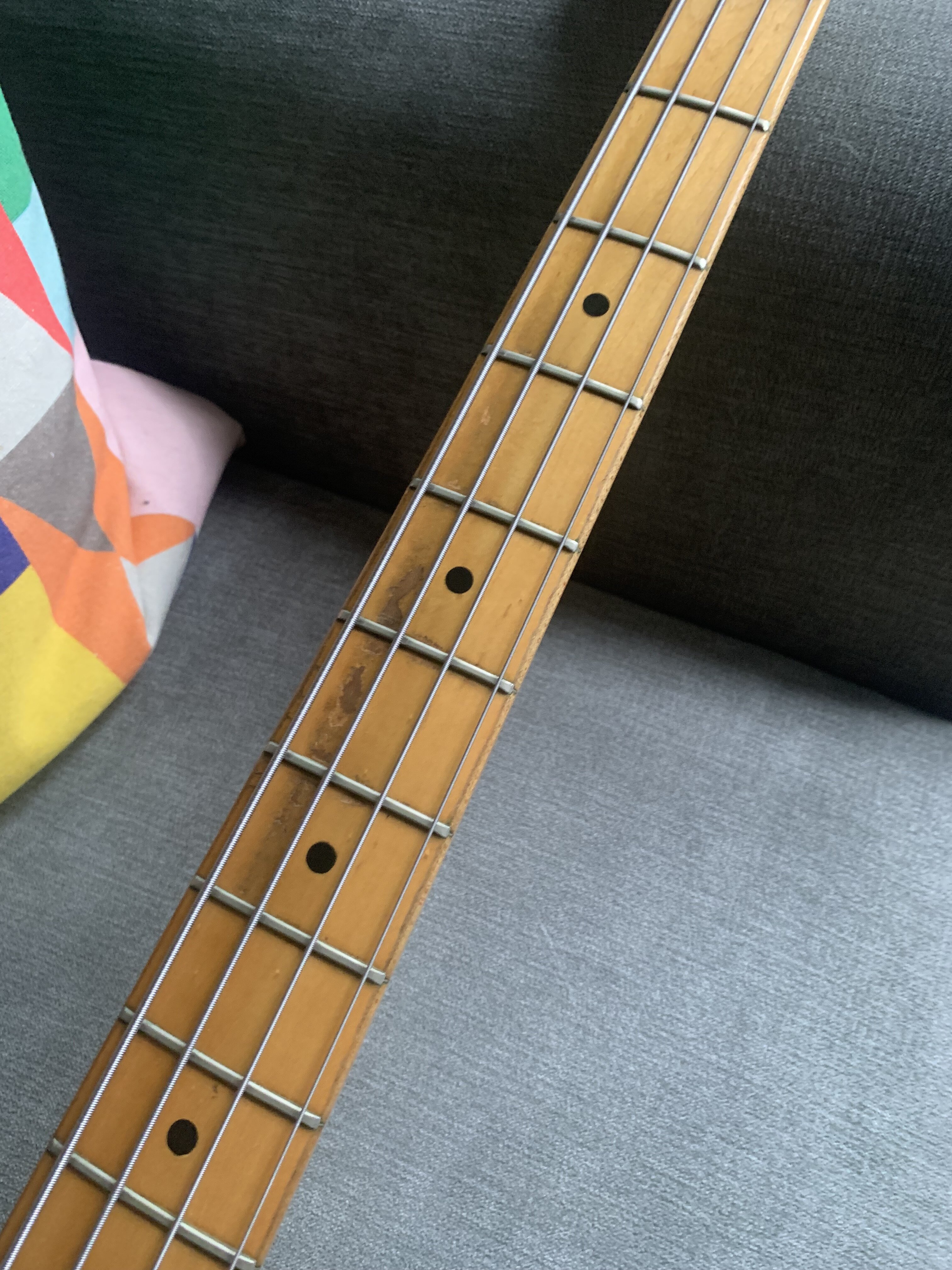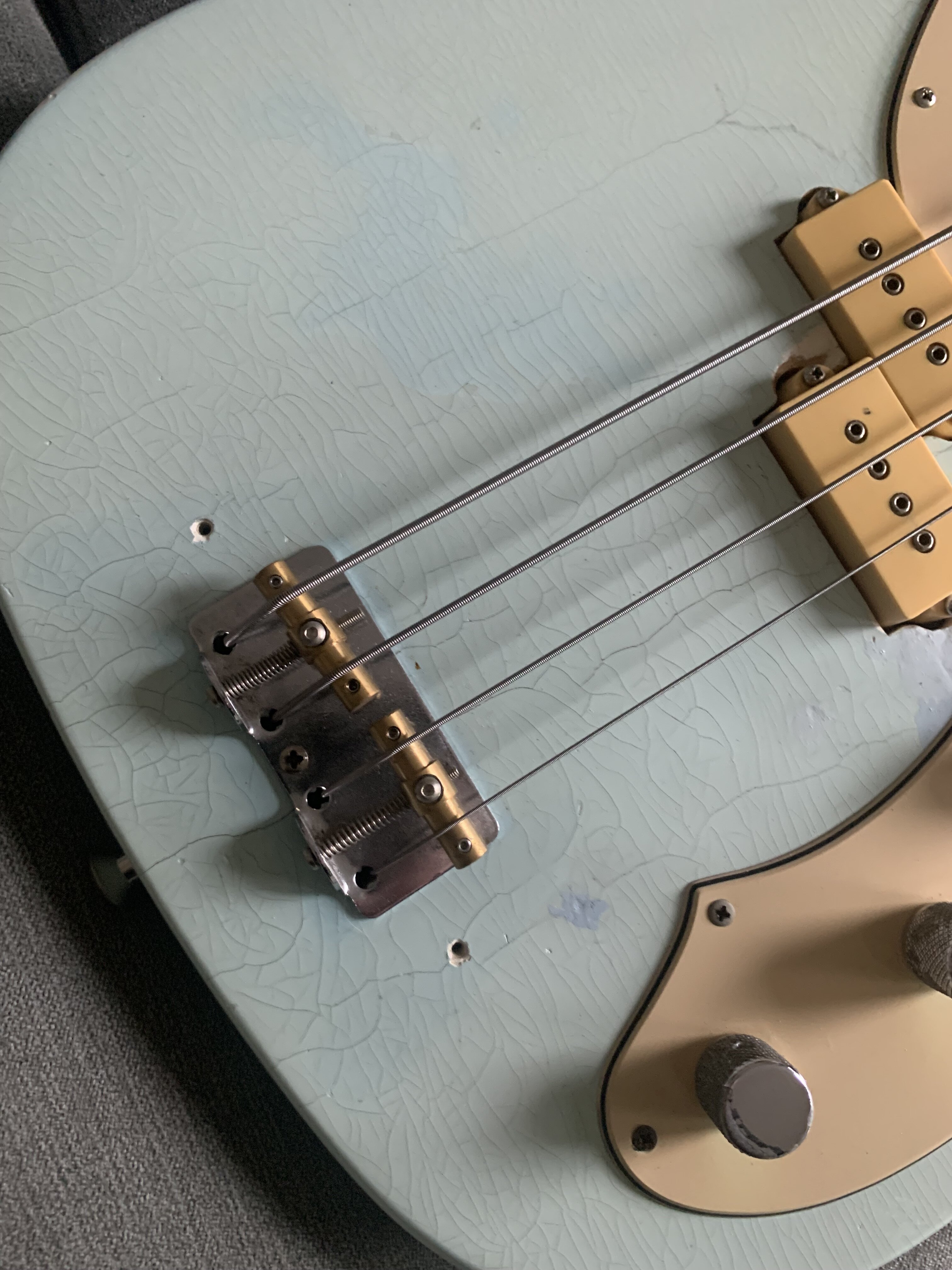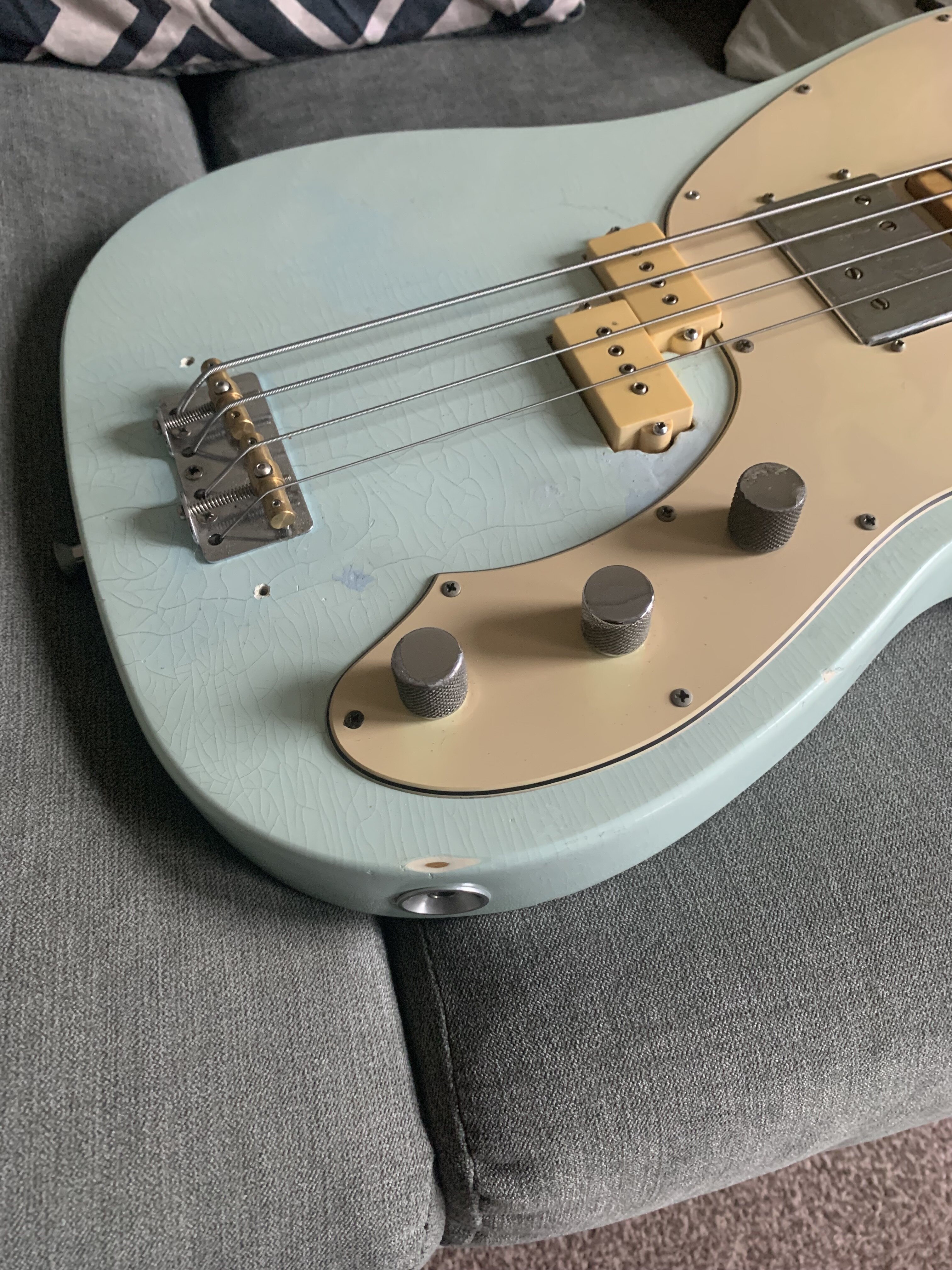 ash Posted 1 hour ago Posted 1 hour ago This is more of a feeler to see if there is any interest. My old Fender Telecaster Bass dates from 1972. The Basschatter who I got it from had the P bass pickup routed and the body refinished by John Diggins. When we exchanged it a few years ago it didn’t have the original Fender humbucker however I managed to source an original which I imported from the US. I added an extra original volume pot from the same era and sourced a 70’s Fender knob. It is wired like a Jazz bass two volumes and one tone. It has the three bolt neck with working micro tilt and a working bullet trussrod. The original finish was natural as there is a stamp under the mudbucker. The tuners, neck , frets and body are all original although I’m not sure of all of the pots and definitely not the wiring. The bridge had been swapped for a four saddle top loader job so I got a two saddle through strung with saddles that can be angled. More in keeping with the original but easier to intonate. The P bass pickup is a cream coloured late 70s vintage Dimarzio DP that sounds fantastic. The big humbucker has real sub bass to it and there are some classic tones to be had between the two. The Diggins refinish is intentionally worn with crazing however there are areas where the routing was rough that have been filled and touched up on the front. There is a larger buckle rash area on the back also touched up rather clumsily as the colour match is very poor. It protected the wood at least! My original intention was to take it back to a natural finish but I’ve not got round to it - as usual…. The scratch plate is a copy of some kind, when I got it the bass looked more like a Mike Dirnt Tele. My luthier cut out the area for the Fender humbucker. The ashtray is original and you can see the remains of the perished rubber mute on the inside of it. The bass plays well and is strung with Elixir coated strings. It is quite hefty but nothing like some of the Tele basses or other basses of this era I’ve played. It is around 4.7kgs. The bass in an earlier incarnation is pictured and described in the Haynes Fender Bass Manual. It’s a players bass rather than one for the collector. It could be restored to the original spec if you really wanted to but you’d have a one trick - albeit a good trick - pony. I’m reluctant to shift it but my P bass isn’t selling and having had some large vets bills recently I need to free up some cash. It is a rare opportunity to buy one of these old Telecaster basses at a sensible (I hope you think so too) price. Pickup preferred but I can post in the UK at cost. Sorry no trades. There isn’t a case with it but I’ll try and source one if you want it posting, otherwise it comes with a Fender gigbag. I’ll be sad to see this one go. I’ll add more pics if required. All the usual ID stamps are on the neck heel and pocket I would rather not remove the neck as they are a faff to set up with the micro tilt. 8 Quote
