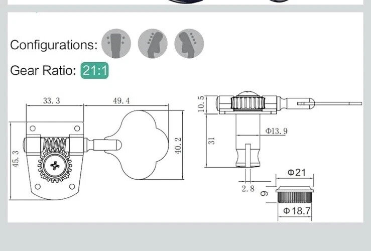 Guyker Bass Machine Heads (3R + 2L) - 1:21 Ratio Gear Open Frame Tuners Black New unused